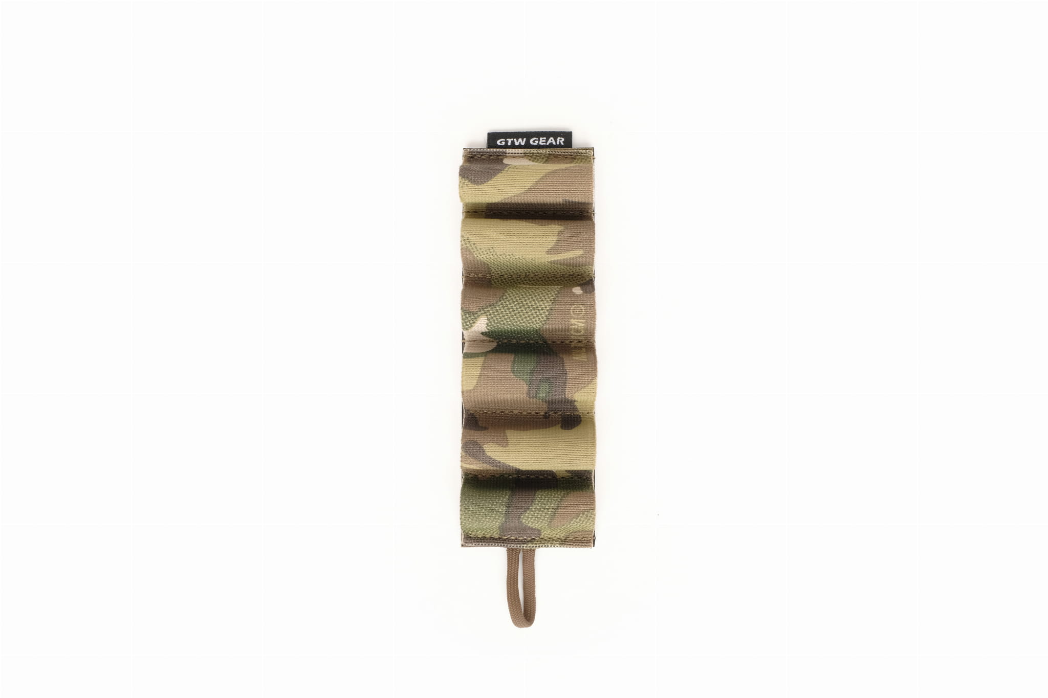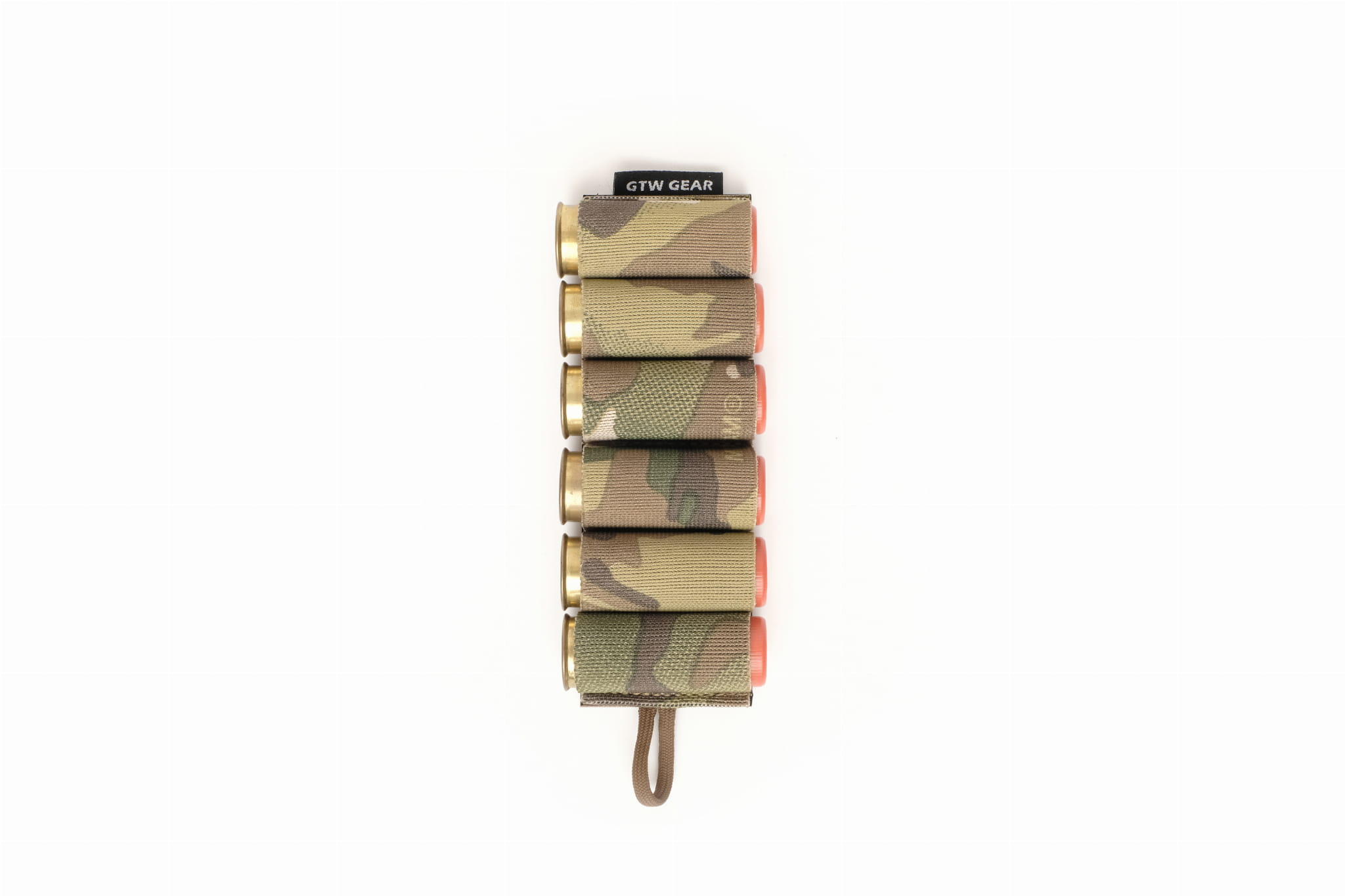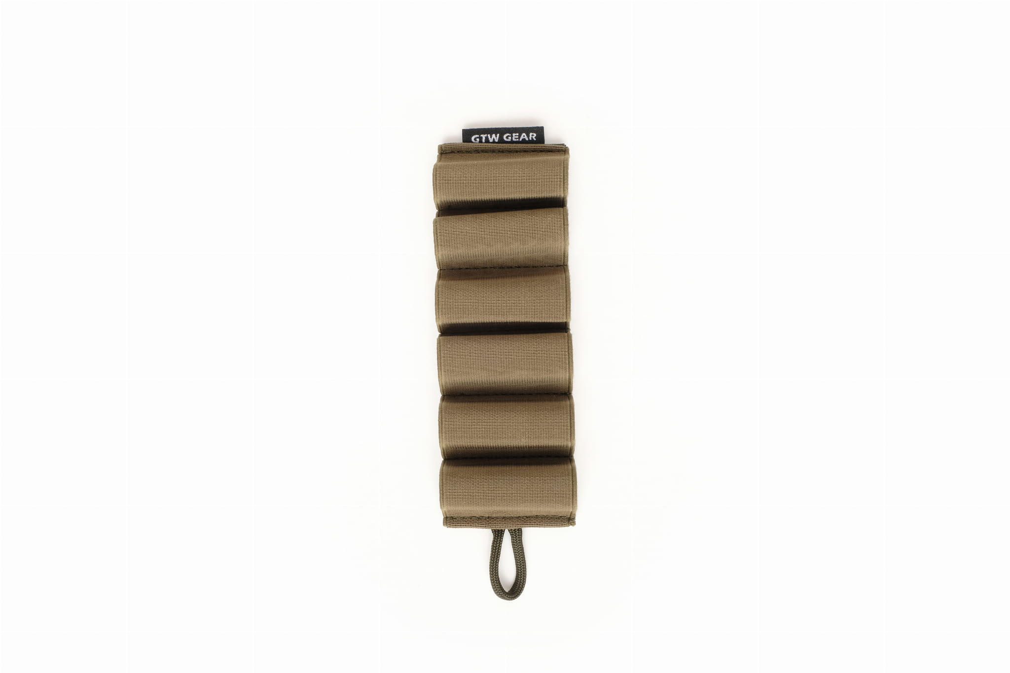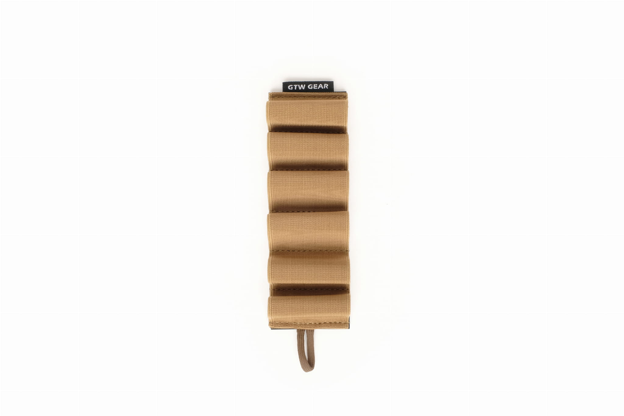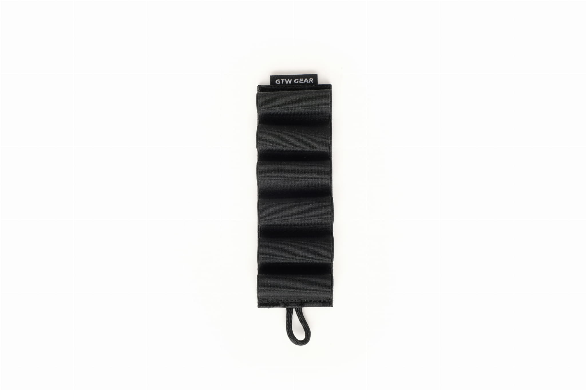 Elastic organizer that allows carrying six rounds of ammunition for a 12GA caliber rifle.