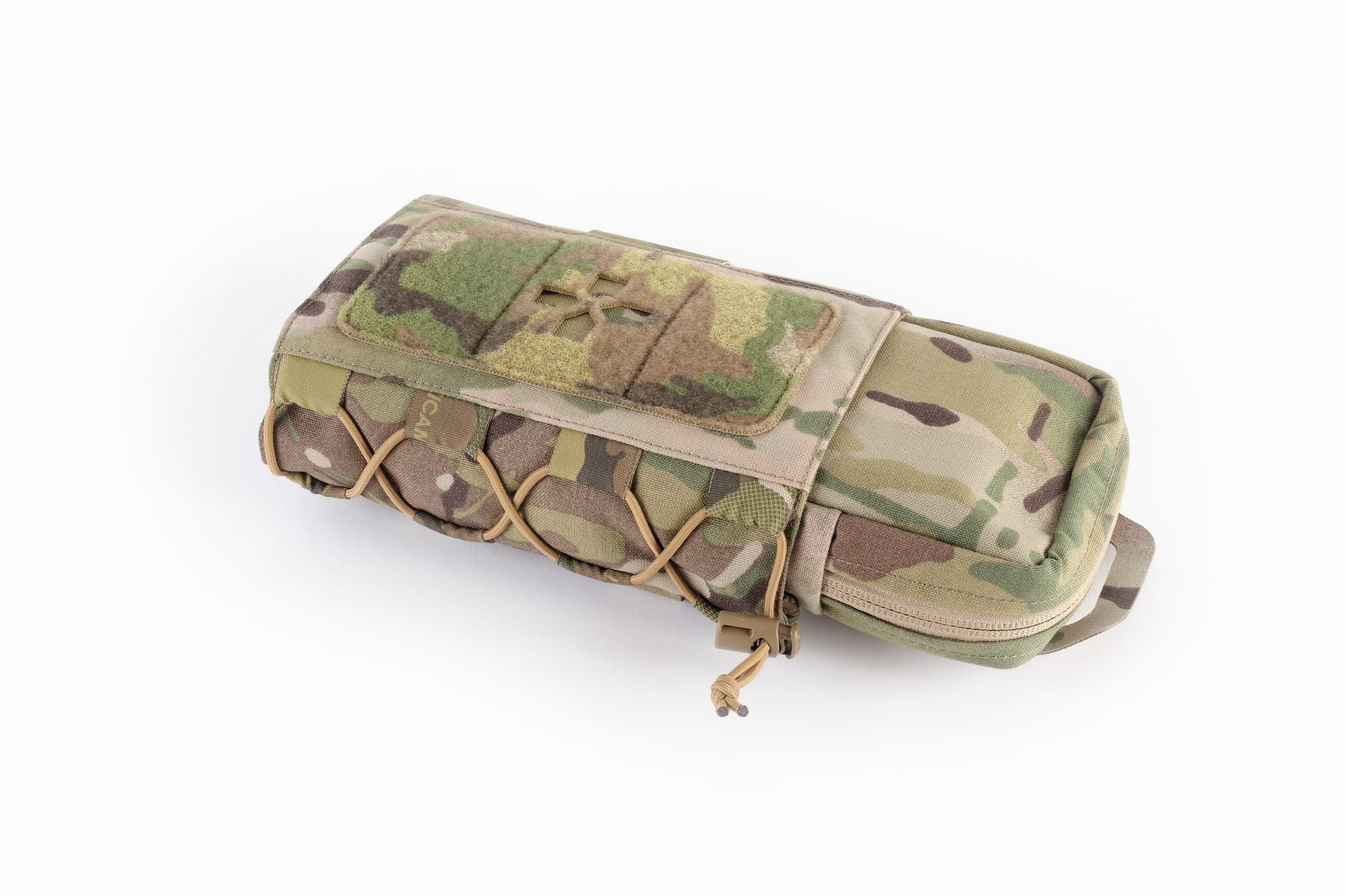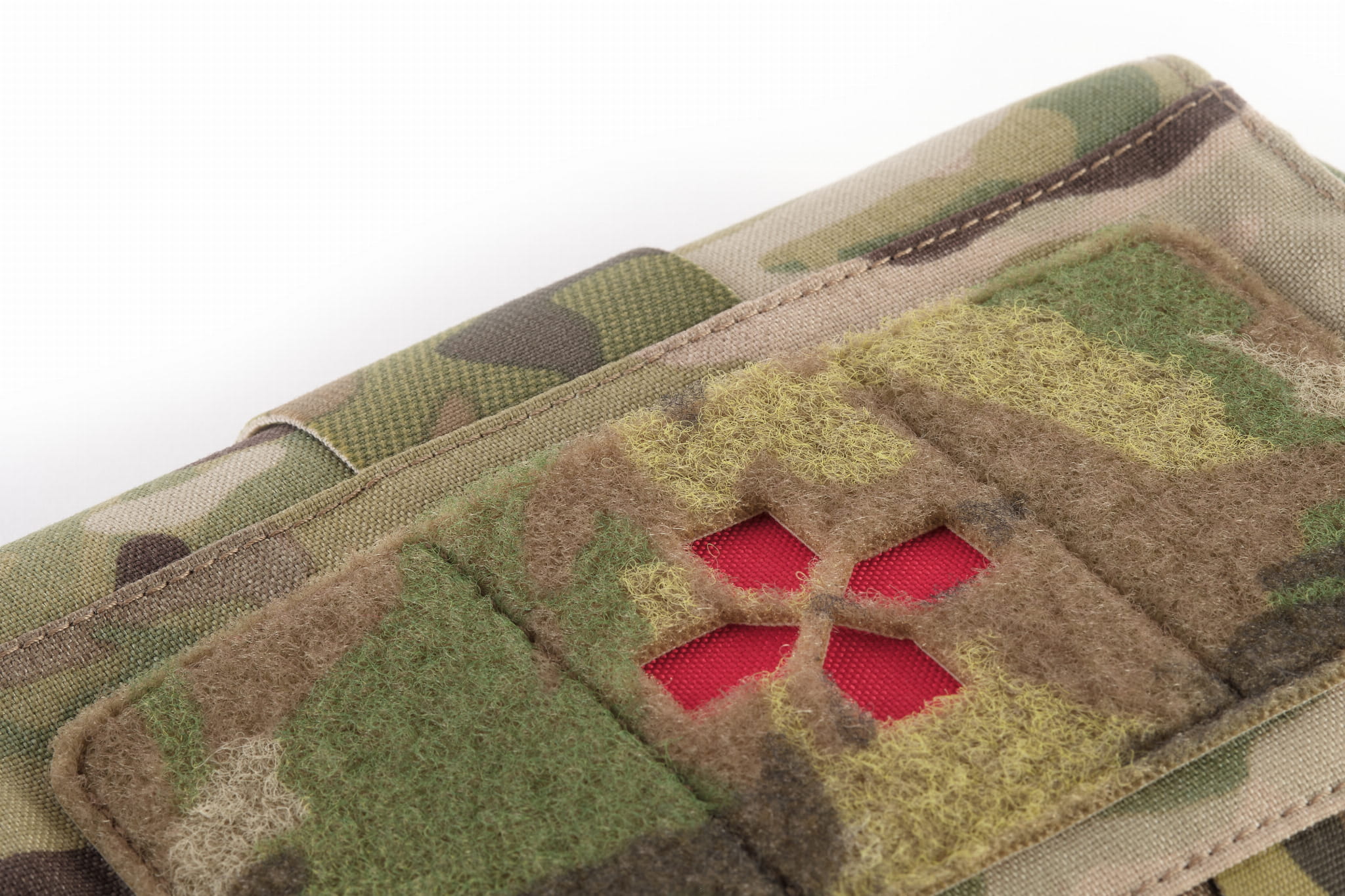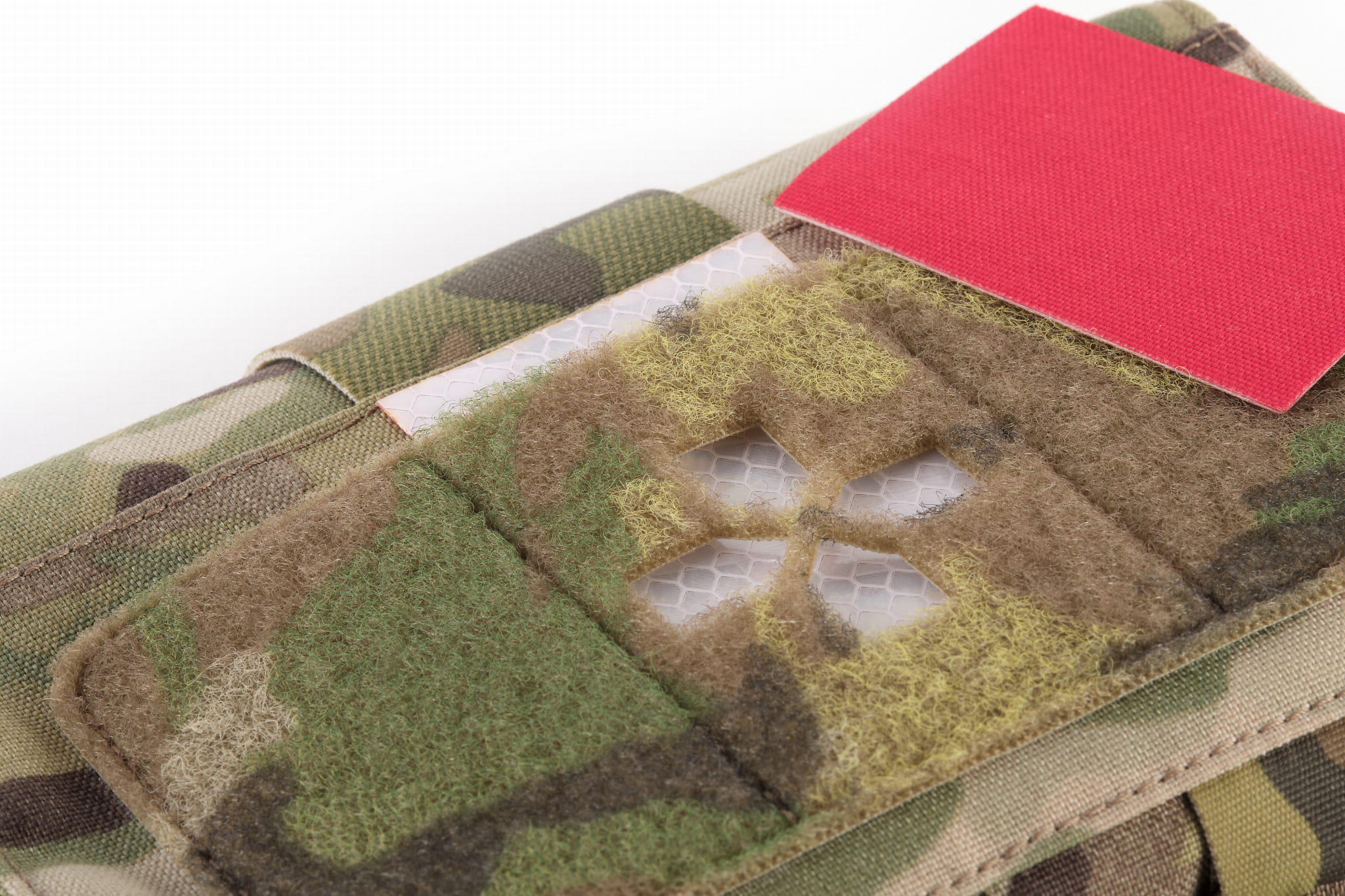 On the front of the sleeve there is a large Velcro with a cross. The set includes a double-sided insert, by using which it was possible to obtain as many as three colors of the cross to choose from: red, reflective, and after removing the insert the color matches the color of the IFAK. In addition, in the upper part of the sleeve there is a 50mm wide elastic webbing adapted for carrying a tourniquet.